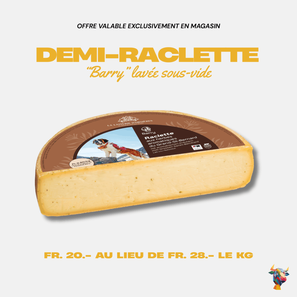 À la Laiterie d’Orsières, la demi-raclette « Barry » lavée sous-vide est en promotion à Fr. 20.- le kg au lieu de Fr. 28.-.
